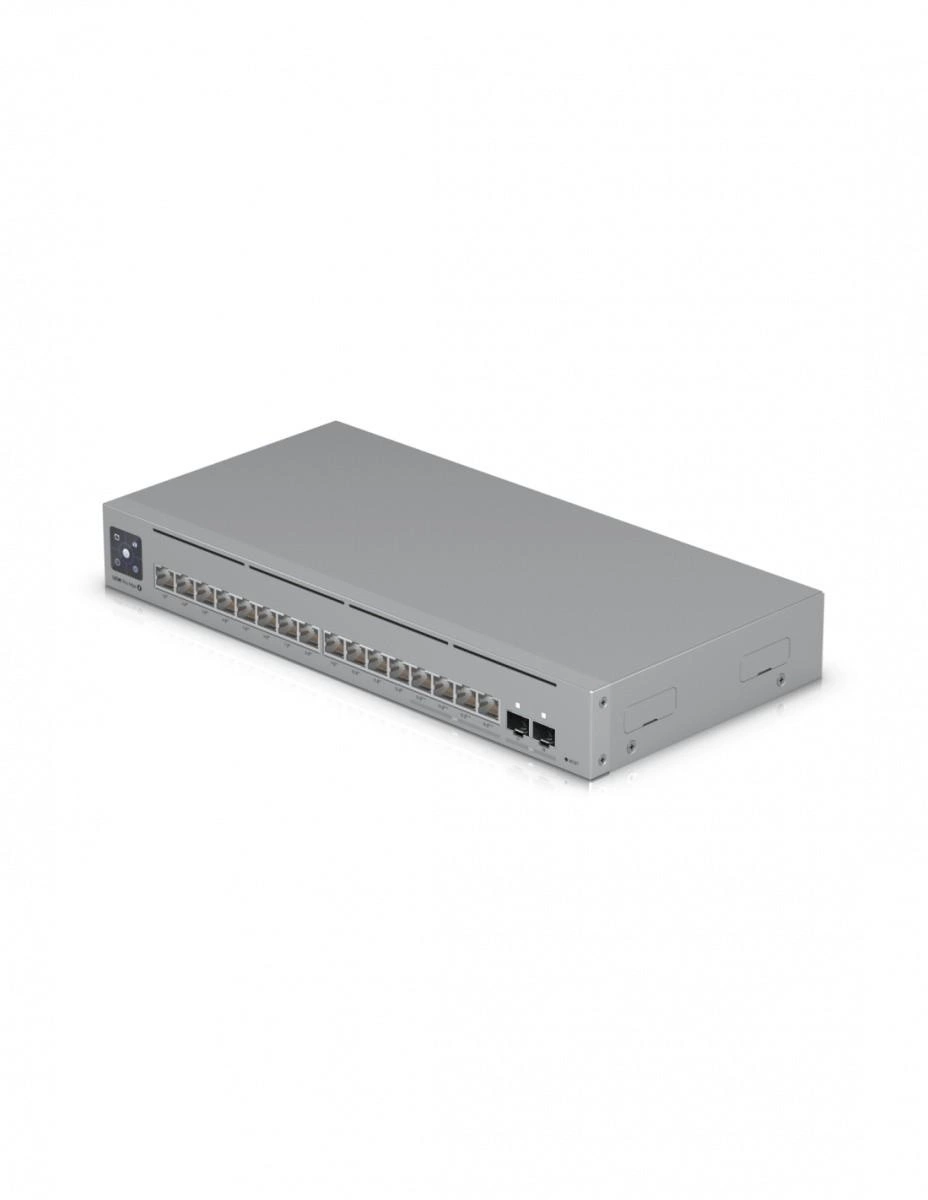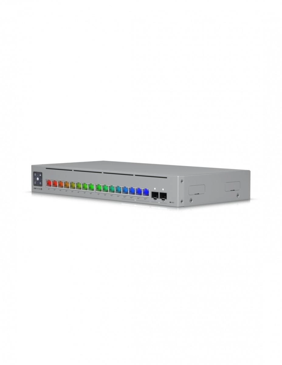 USW-Pro-Max-16-PoE to zaawansowany 16-portowy przełącznik warstwy 3 z technologią Etherlighting, obsługujący 2,5 GbE oraz wyposażony w wyjścia PoE++. Każdy port jest wyposażony w podświetlanie Etherlighting, co ułatwia identyfikację lokalizacji portu, prędkości/łącza oraz natywnej sieci VLAN. Przełącznik oferuje cztery porty 2,5 GbE PoE++ oraz dwanaście portów GbE PoE+, łącznie z mocą PoE wynoszącą 180 W. Dodatkowo posiada dwa porty 10G SFP dla wyższych wymagań przepustowości. Możliwość montażu na biurku, ścianie lub w szafie rack (wymaga dodatkowych akcesoriów do montażu w szafie), oraz cichy, bezwentylatorowy system chłodzenia, zapewniają elastyczność i niezawodność działania w różnych środowiskach sieciowych.
