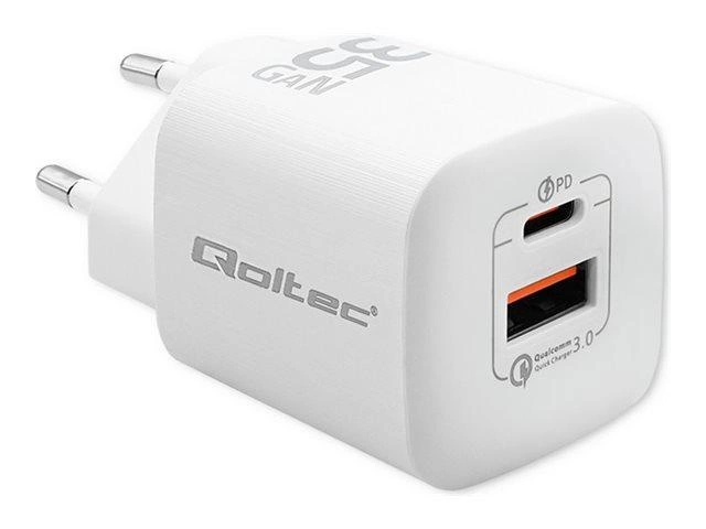 QOLTEC 50763 Ładowarka sieciowa 35W GaN ULTRA / 5-20V / 2.25 3A / 1 x USB typ C PD / 1 x USB / Biała