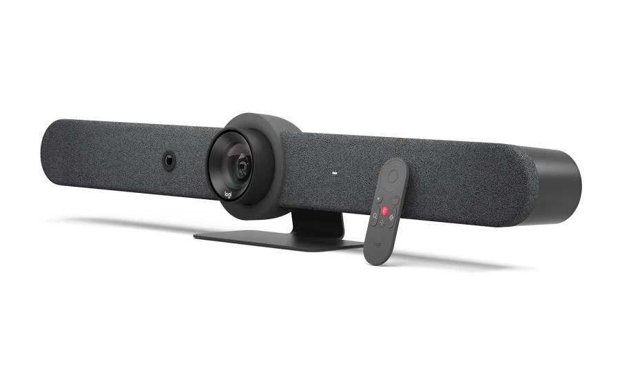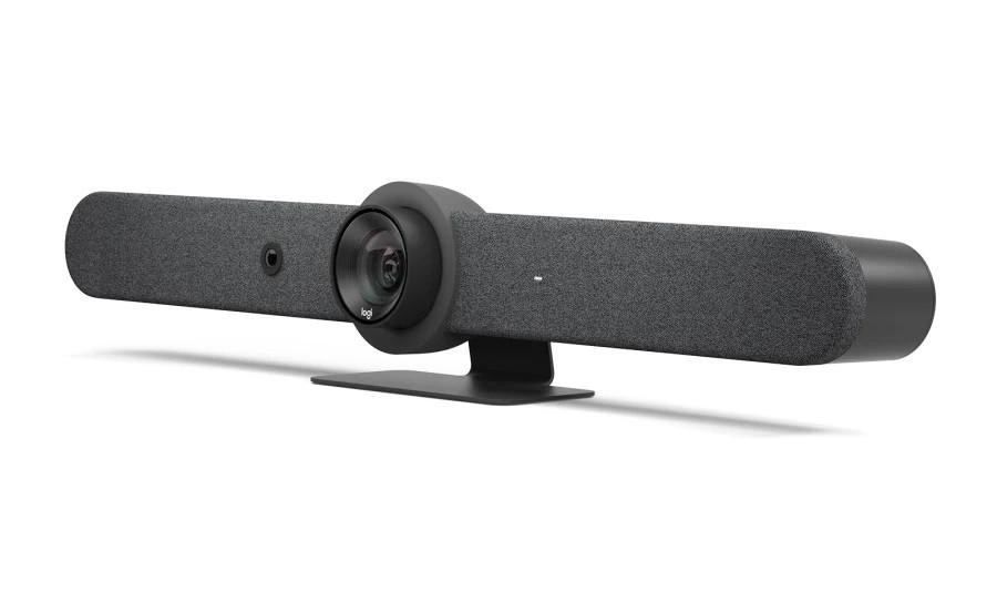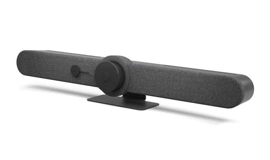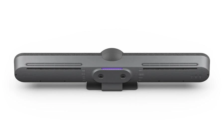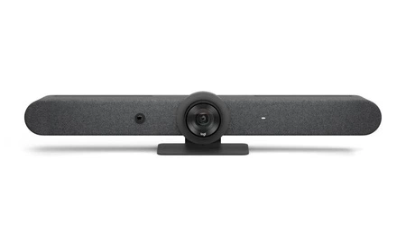 - Elementy wbudowane: 6 mikrofonów formujących wiązkę, kamera PTZ, 2 głośniki, wizjer AI, system zarządzania i utrzymania przewodów, statyw stołowy, platforma CollabOS Logitech