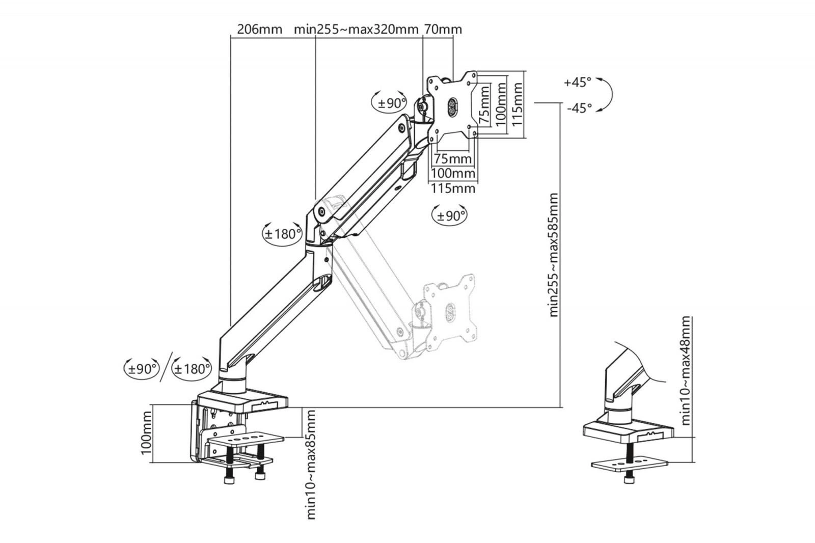 Ramię biurkowe podwójne z zaciskiem, 2xLCD, max. 35", max. obciążenie 2x15kg, ze sprężyną gazową