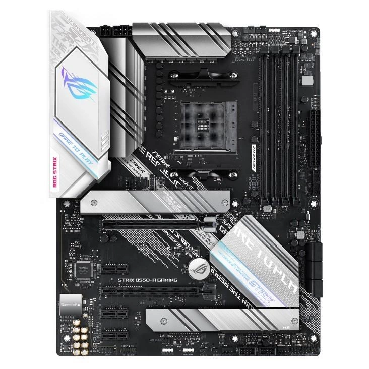 Płyta główna ROG Strix B550-A Gaming skupia na sobie wszystkie spojrzenia dzięki wykonaniu w kolorach białym i srebrnym z przeprojektowanym logo ROG oraz wyrytymi w powierzchni napisami w cybernetycznej czcionce na osłonie panelu I/O. Z nowymi elementami wzornictwa płyty główne ROG Strix są ukierunkowane na przyszłość, a jednocześnie wyraźnie widać ich gamingowe korzenie.