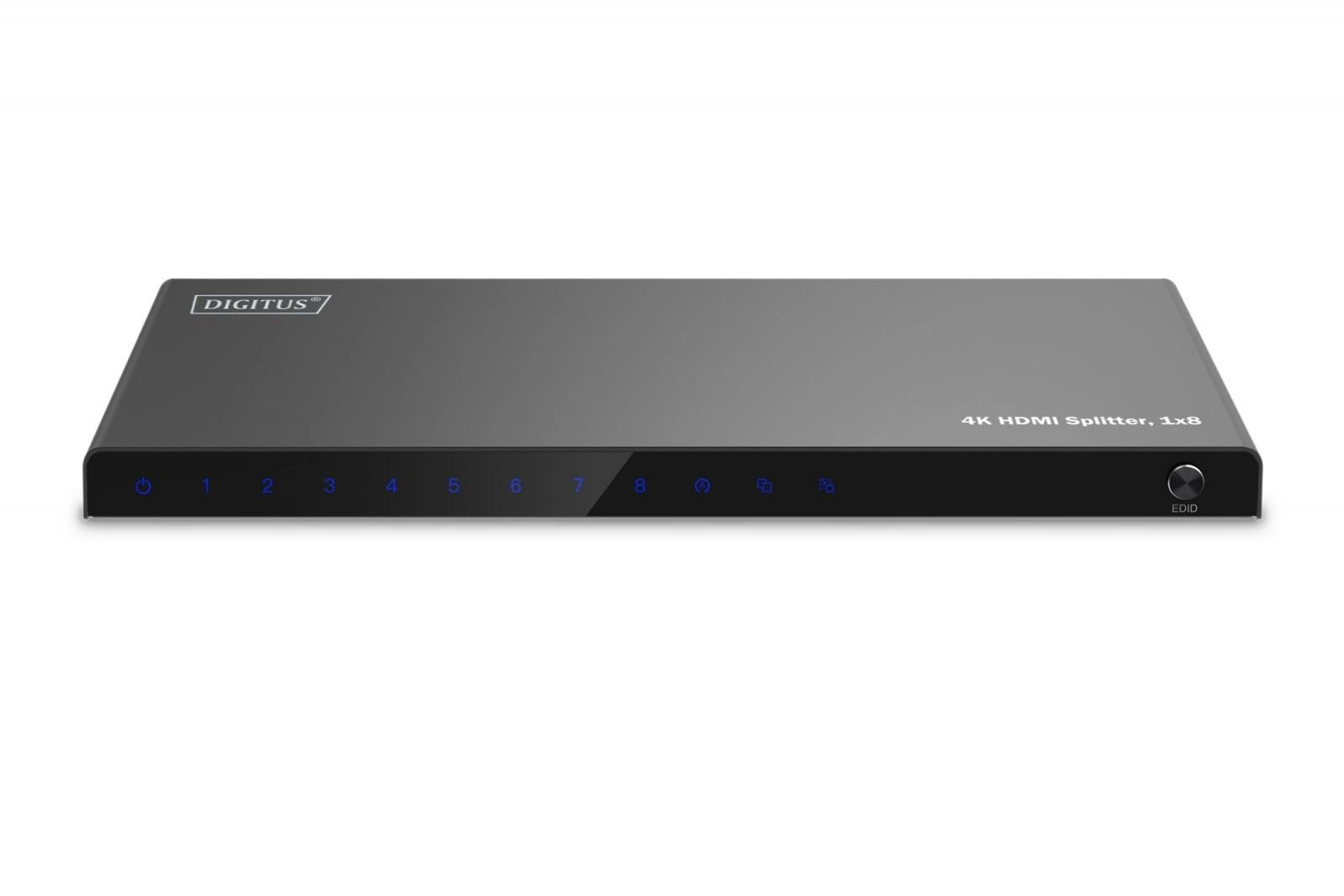 Splitter (rozdzielacz) HDMI DIGITUS rozdziela/duplikuje sygnały audio i wideo z urządzenia HDMI do 8 telewizorów, monitorów lub projektorów w jakości UHD 4K / 60 Hz. Korzystając z funkcji zarządzania EDID, możesz wybrać jeden z 3 trybów (Copy, Auto, Downscaler). Zintegrowana funkcja downscaling obsługuje wyświetlanie 4K na wyświetlaczach Full HD. Zarówno wyświetlacz 4K jak i Full HD mogą być dodatkowo obsługiwane jednocześnie. Dzięki funkcji Auto-EDID rozgałęźnik automatycznie wykrywa podłączone wyświetlacze - nie ma potrzeby dokonywania ręcznych regulacji.