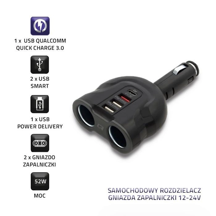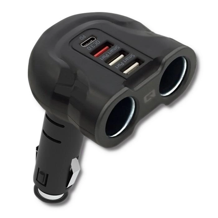 Samochodowy rozdzielacz gniazda zapalniczki marki Qoltec charakteryzuje się najlepszą jakością oraz wykonaniem z wysokiej jakości materiałów. Łączy ze sobą nowoczesność, stylowy design oraz przede wszystkim funkcjonalność. Został on wyposażony dwa gniazda zapalniczki oraz 2 porty USB Smart, 1 USB Qualcomm Quick Charge 3.0 i 1 USB Power Delivery co zwiększa komfort użytkowania pozwalając na jednoczesne szybkie ładowanie kilku sprzętów takich jak tablet, smartfon, nawigacja i innych urządzeń mobilnych przy jednocześnie zachowanej możliwości korzystania z zapalniczki.