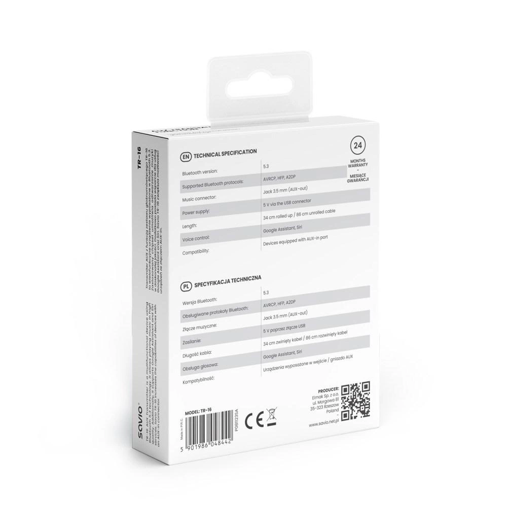 SAVIO TRANSMITER AUX, USB, BLUETOOTH 5.3, FUNKCJA ZESTAWU GŁOŚNOMÓWIĄCEGO, TR-16
