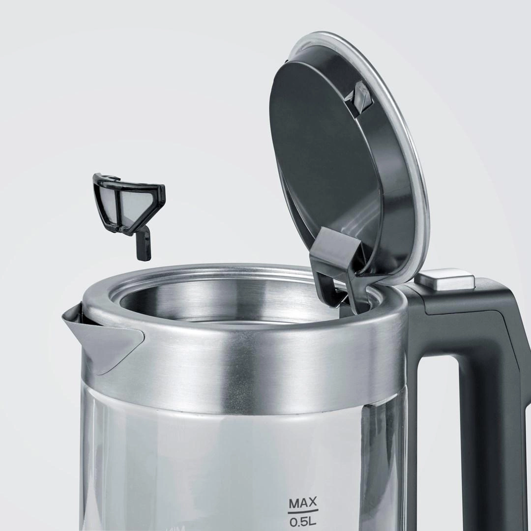 SEVERIN CZAJNIK ELEKTR. SZKŁO-STAL, REG. TEMP. W RĄCZCE, ZAKRES TEMP. 40°C-100°C, POJ. 0,5L, ZAKRYTA GRZAŁKA, 1100W WK3458