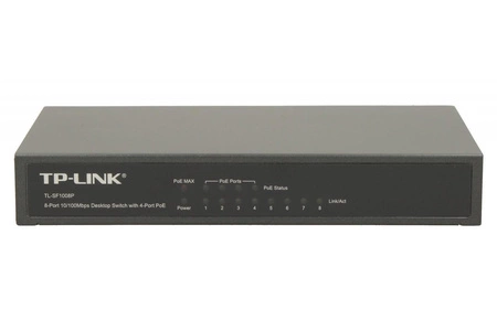 - Porty: 8 portów 10/100M RJ45, w tym 4 porty PoE (1-4), automatyczna negocjacja prędkości połączeń, automatyczne krosowanie MDI/MDIX