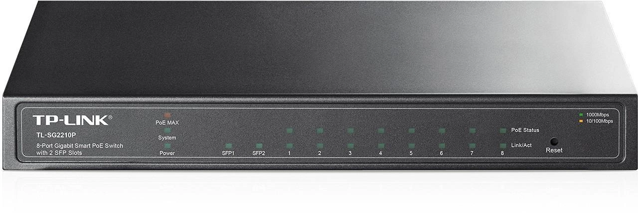 Gigabitowy przełącznik Smart TL-SG2210P firmy TP-LINK wyposażony jest w 8 gigabitowych portów RJ45 mogących łącznie dostarczyć 53W mocy oraz w 2 sloty SFP. Urządzenie zapewnia dużą wydajność przesyłania danych, zaawansowane funkcje zabezpieczeń oraz QoS oraz rozbudowane funkcje zarządzania ruchem w warstwie drugiej.