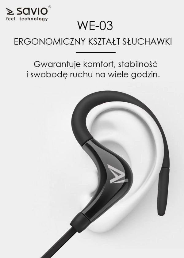 Słuchawki bezprzewodowe, z mikrofonem, ze słuchawkami SAVIO WE-03 (dokanałowe, sportowe; bezprzewodowe, Bluetooth; z wbudowanym mikrofonem; kolor czarny