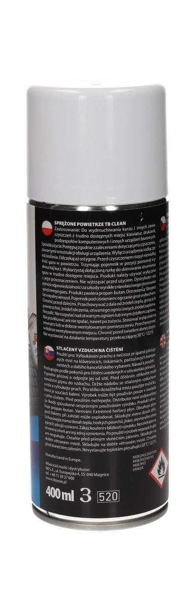 Sprężone powietrze TB Clean wydmuchuje kurz i zabrudzenia z trudno dostępnych miejsc w urządzeniach takich jak klawiatury, drukarki, CD-ROM/disk drivers, kopiarki, faxy itp.