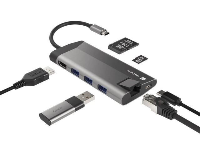 Natec Fowler Plus to niewielki multiport, który rozwiąże Twoje problemy i pozwoli Ci podłączyć co tylko zechcesz. Wyposażono go w aż 8 portów, pośród których znajdziesz 3 gniazda USB 3.0 typu A, port HDMI 1.4 wspierający rozdzielczość 4K, dwa czytniki kart (SD i microSD) a nawet gniazdo RJ-45 (1 Gb/s) i USB-C obsługujące standard ładowania Power Delivery 3.0. Korzystanie z akcesoriów jeszcze nigdy nie było tak wygodne.