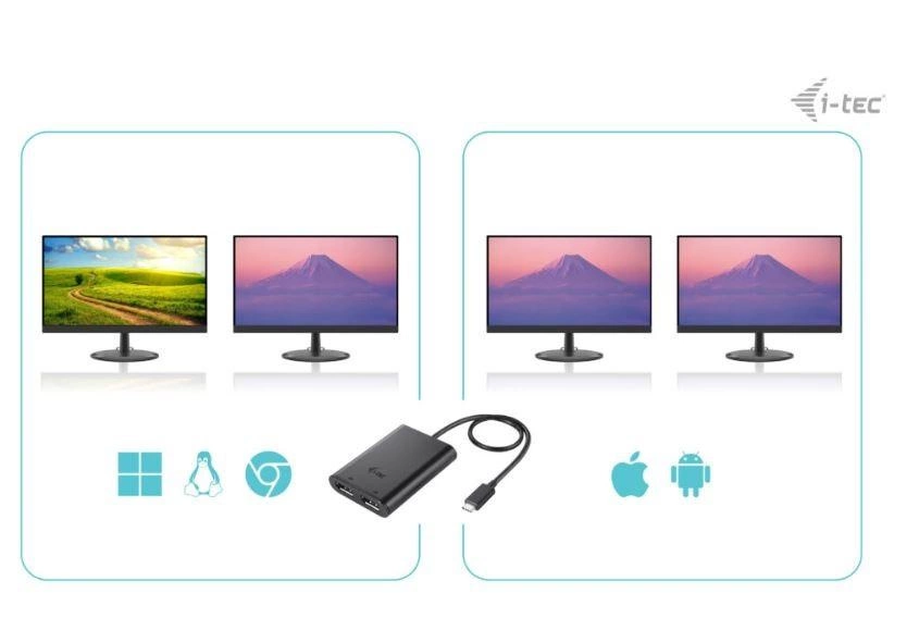 Rozbuduj swoje stanowisko pracy o dwa zewnętrzne monitory DisplayPort, podłącz projektory lub telewizory do notebooka, tabletu lub komputera PC za pomocą nowego złącza USB-C lub Thunderbolt 3. Adapter obsługuje 1x 8K / 30 Hz lub 2x 4K / 60 Hz.