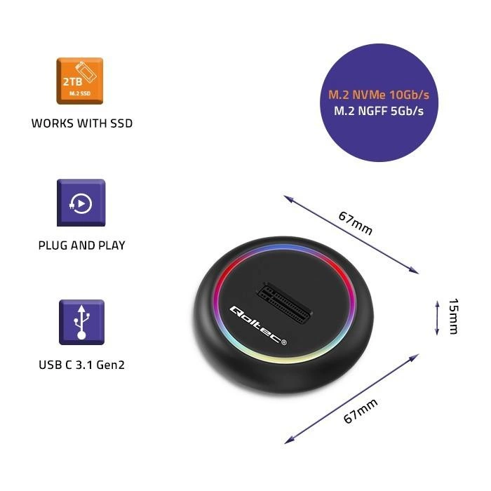 Stacja jest kompatybilna z dyskami M.2 o interfejsie SATA oraz NVMe. Oferuje szybkość transmisji danych do 10 Gb/s. Dodatkowo stacja dysków marki Qoltec to urządzenie: