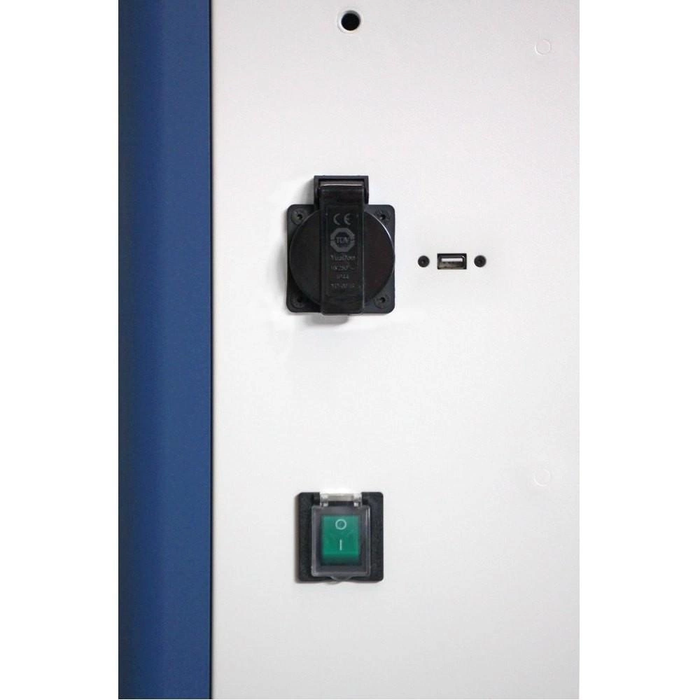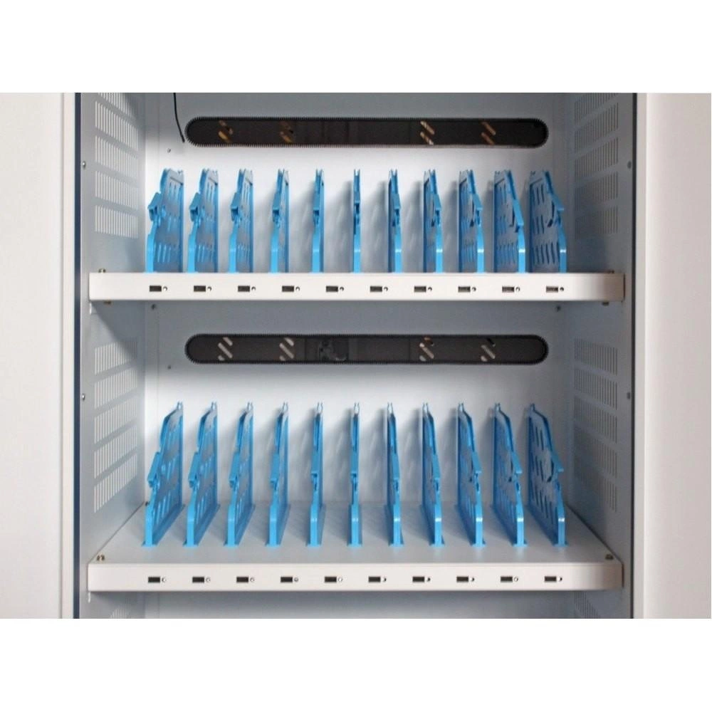 - Wyposażona w 30 portów USB (5V / 2.1A) we frontowej części szafy - po 10 portów USB na każdej z trzech półek