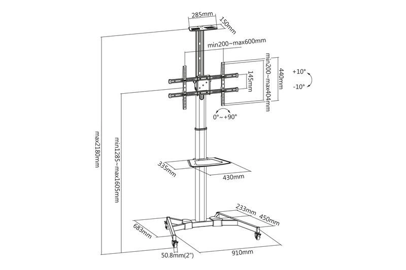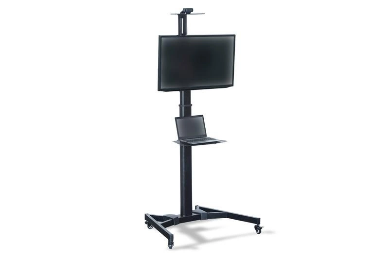 Nasz wózek na telewizor to elastyczne rozwiązanie do prezentacji w salach konferencyjnych lub szkołach. Cztery kółka pozwalają na swobodne przemieszczanie wózka, a hamulec postojowy gwarantuje stabilność. Dwa regały na odtwarzacz DVD, laptop i kamerę internetową zapewniają dostateczną ilość miejsca na całe wyposażenie niezbędne do prezentacji. Wózek jest przeznaczony do montażu monitorów o przekątnej ekranu od 94 do 178 cm i maksymalnej wadze 50 kg. Regulacja wysokości w zakresie do 218 cm oraz kąta nachylenia w zakresie do 10 stopni pozwalają na wygodne oglądanie także z dalszej odległości. Wózek na telewizor jest przeznaczony do telewizorów LED, LCD i plazmowych wszystkich marek.