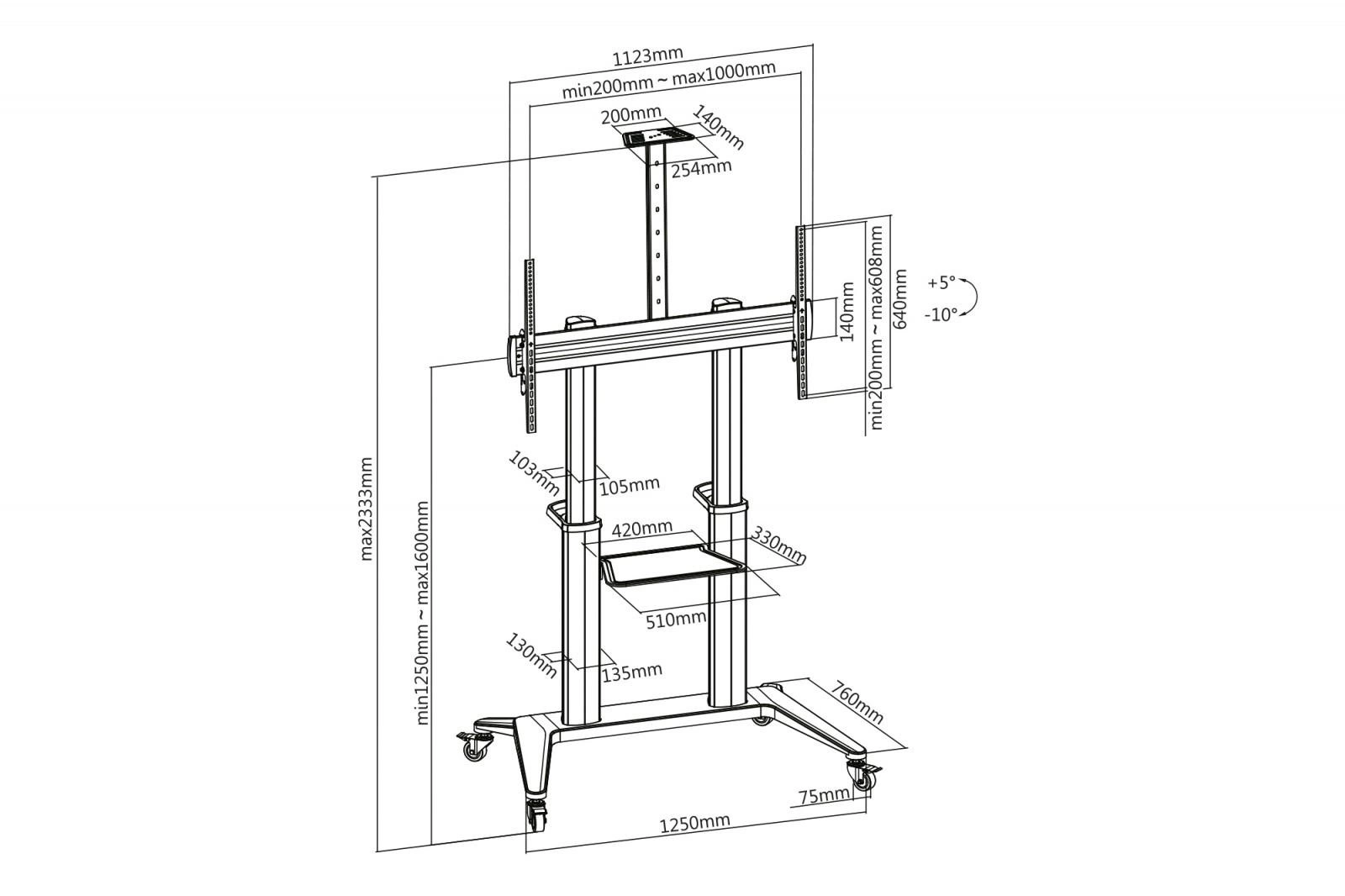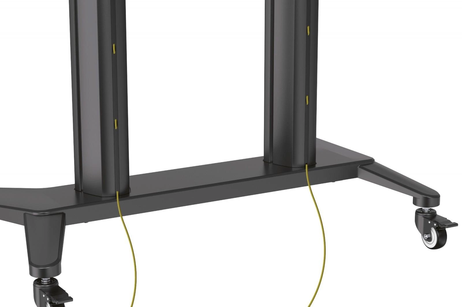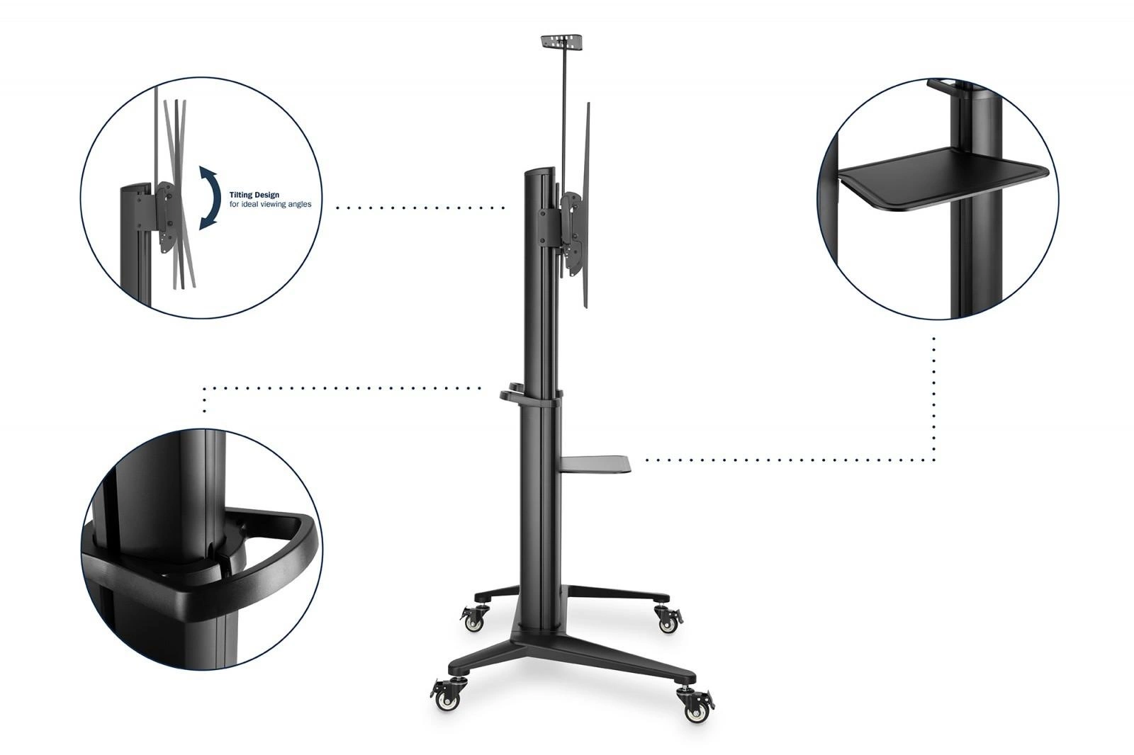 Stojak pod telewizor do prezentacji oferuje solidny i wytrzymały wspornik do monitorów o przekątnej ekranu od 70 do 120 cali, zapewniając maksymalną nośność 140 kg. Dodatkowo posiada uchwyt do mocowania kamery z regulacją wysokości oraz półkę na notebooki, odtwarzacze multimediów itp. Stojak można elastycznie ustawić i posiada wbudowany kanał kablowy oraz praktyczne uchwyty z tyłu. Konstrukcja jest wykonana z wyjątkowo mocnego i lekkiego aluminium, stali oraz tworzywa sztucznego. Idealne rozwiązanie do sal konferencyjnych, szkoleniowych, hal wystawowych i innych zastosowań na różnych eventach.