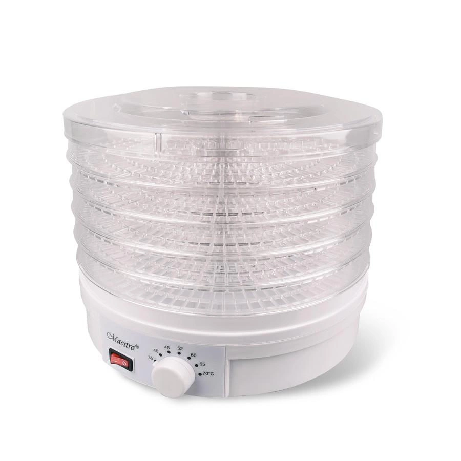 Suszarka do grzybów, warzyw i owoców Maestro MR-765 to wydajne urządzenie o mocy 245 W, idealne do suszenia różnorodnych produktów, takich jak grzyby, warzywa, owoce, zioła czy chleb. Wyposażona jest w 5 sit o średnicy 32 cm, z wysokością każdego sita wynoszącą 3 cm, co umożliwia jednoczesne suszenie dużej ilości składników.
