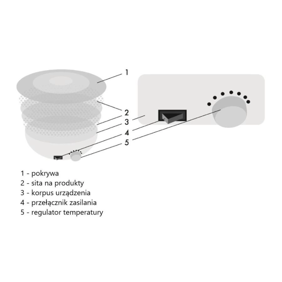 Urządzenie oferuje 7-stopniową regulację temperatury w zakresie od 35°C do 70°C, co pozwala precyzyjnie dostosować warunki suszenia do potrzeb różnych produktów. Mechaniczne sterowanie ułatwia obsługę, a podświetlany włącznik dodaje nowoczesnego wyglądu i ułatwia kontrolę nad pracą suszarki.