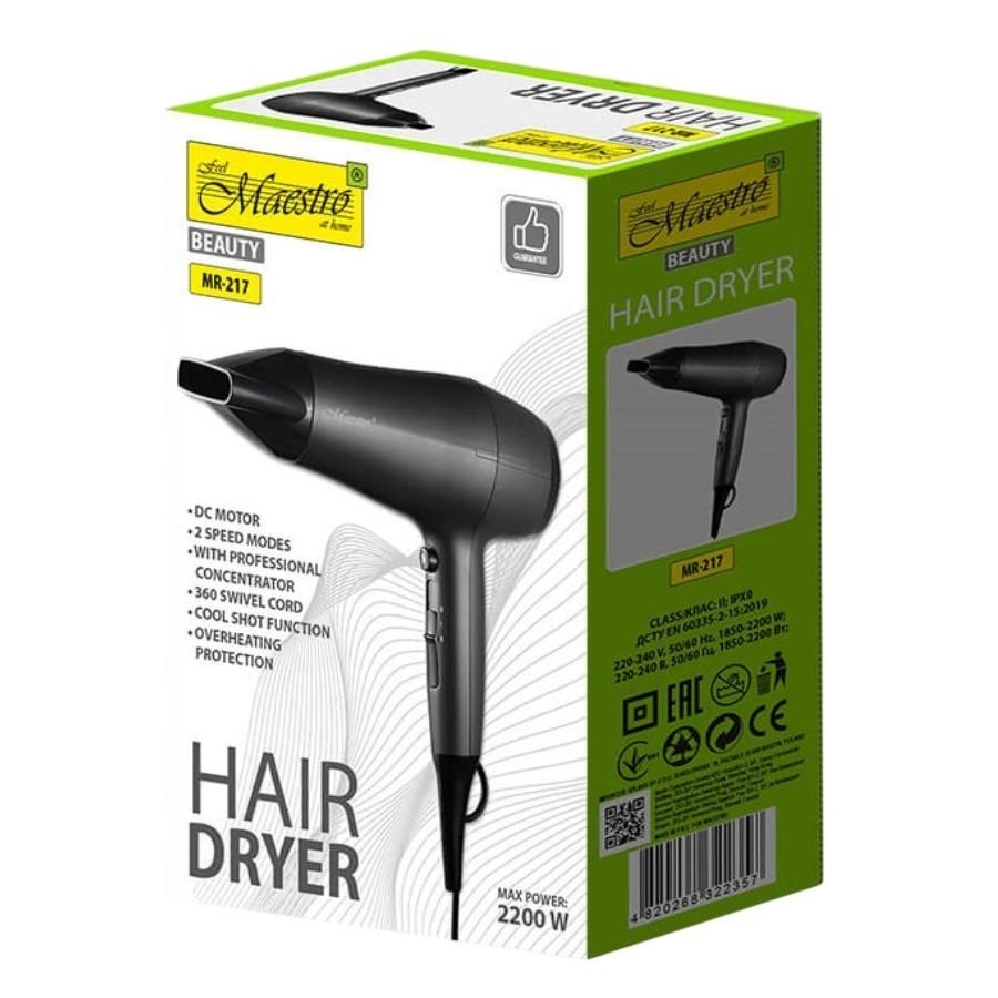 Suszarka do włosów Maestro MR-217 to niezawodne urządzenie o mocy 2200 W, które zapewni szybkie i skuteczne suszenie oraz stylizację włosów.