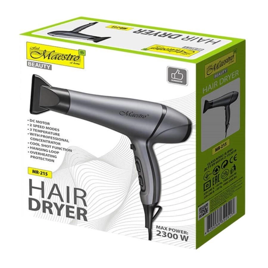 Suszarka do włosów Maestro MR-215 to niezawodne urządzenie o mocy 2300 W, które zapewni szybkie i efektywne suszenie oraz stylizację.
