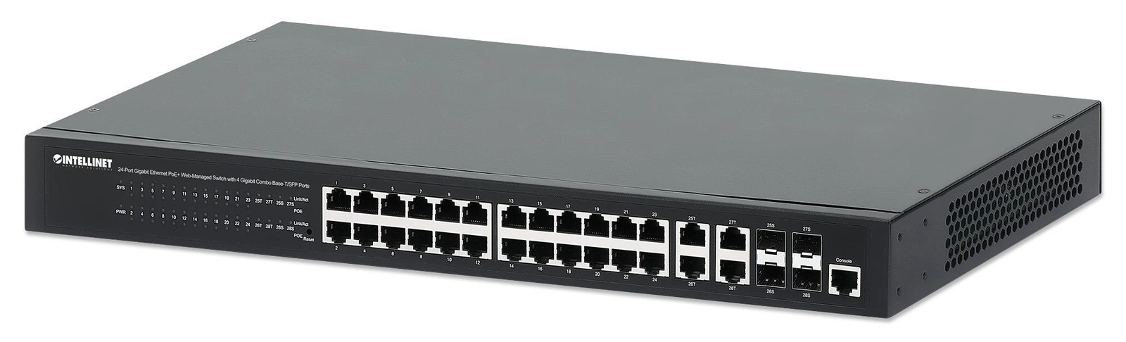 Switch zarządzalny Intellinet 24x 10/100/1000 Mbps PoE+ 370W+4x uplink Combo RJ45/SFP VLAN Rack 19"