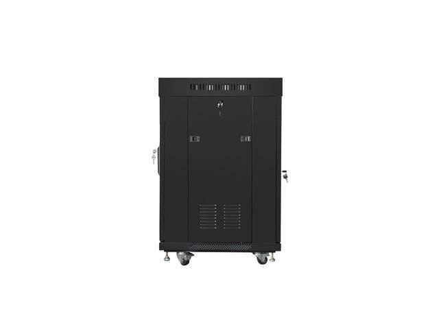 Szafa umożliwia pełną regulację głębokości pionowych szyn montażowych. Wyposażona jest w przednie drzwi ze szkła hartowanego z zamkiem, z możliwością montażu prawo lub lewo stronnego. Posiada zdejmowane boczne panele (z zamkami w zestawie) i tylne solidne stalowe drzwi z zamkiem. Istnieje możliwość wprowadzenia okablowania poprzez zamykany górny i dolny panel (z zaślepkami w zestawie).