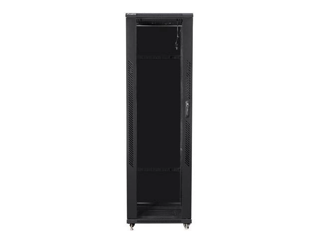 Konstrukcja wykonana jest przy użyciu wysokiej jakości stali walcowanej, charakteryzuje się znakomitym designem i jakością wykonania. Szafa umożliwia pełną regulację głębokości pionowych szyn montażowych. Wyposażona jest w przednie drzwi ze szkła hartowanego z zamkiem, z możliwością montażu prawo lub lewo stronnego. Posiada zdejmowane boczne panele (z zamkami w zestawie) i tylne solidne stalowe drzwi z zamkiem. Istnieje możliwość wprowadzenia okablowania poprzez zamykany górny i dolny panel (z zaślepkami w zestawie). W zestawie znajduje się panel wentylacyjny z 4 wentylatorami 230V. Dodatkowo w komplecie załączone są akcesoria do mocowania szyn nośnych, śruby M6 oraz zaślepki paneli wejściowych, a dzięki konstrukcji do samodzielnego montażu (flat pack), całość znajduje się w 3 płaskich opakowaniach co ułatwia transport.