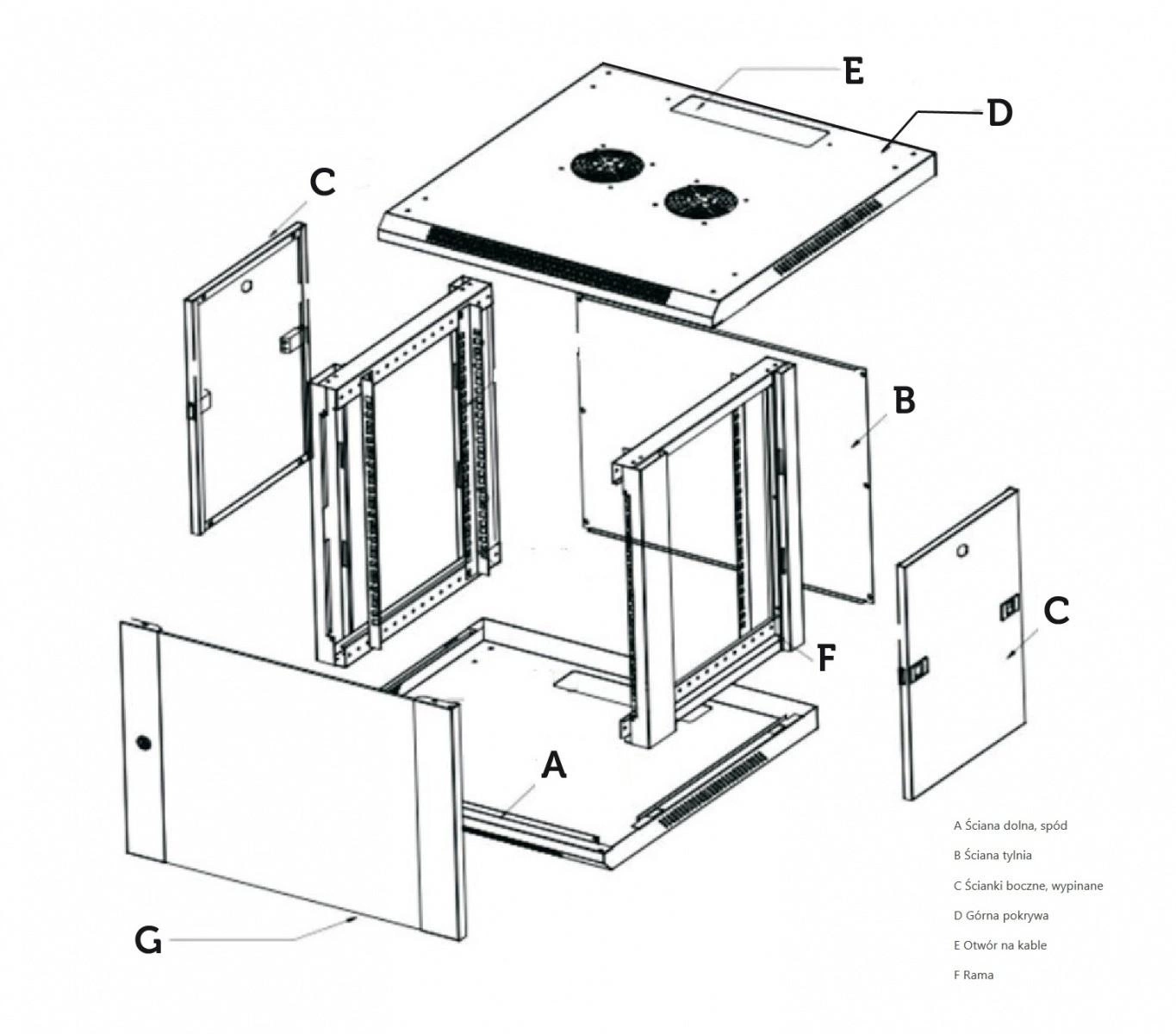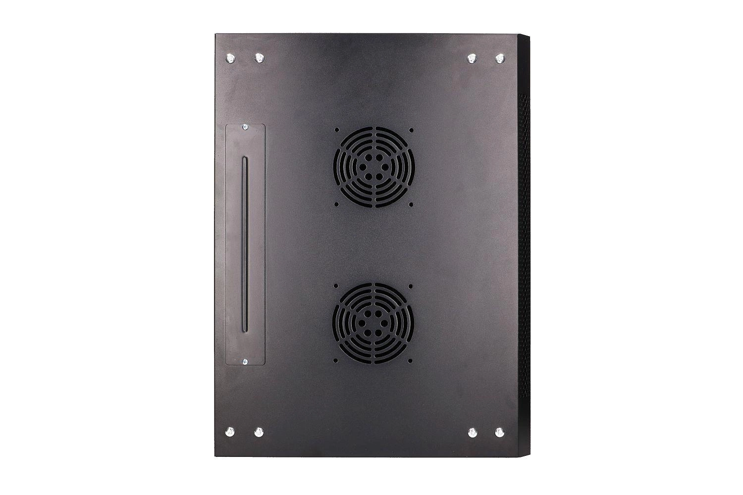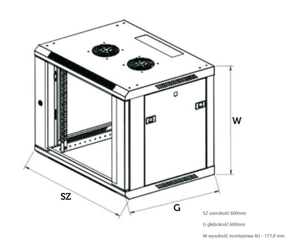 Na suficie szafy przygotowane są 2 miejsca na zainstalowanie wentylatorów w celu lepszego chłodzenia urządzeń, umieszczono tam także dodatkowy przepust do wyciągania kabli.