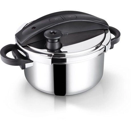 - Szybkowar wyposażony jest w manometr, zawór bezpieczeństwa, zawór bezpieczeństwa kontrolujący nadciśnienie i masywne uchwyty ułatwiające obsługę i zapobiegające oparzeniu