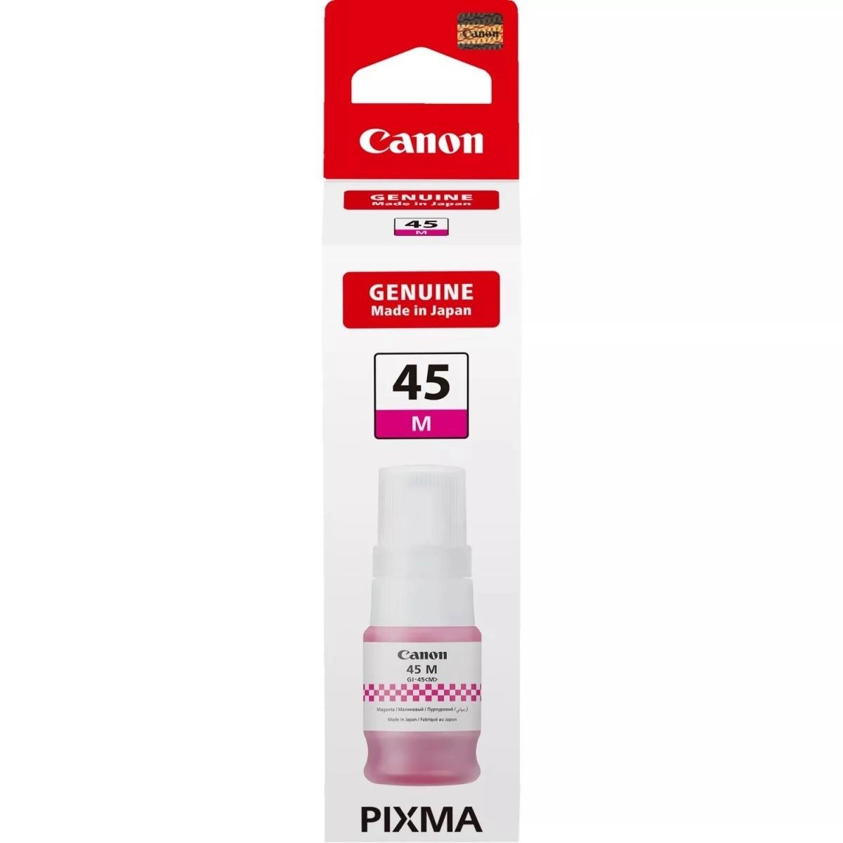 Butelka z purpurowym atramentem Canon GI-45M zawiera purpurowy atrament pigmentowy, który zapewnia wyraźny wydruk dokumentów biznesowych i zdjęć zarówno w domu, jak i w pracy. Korzystanie z pełnego zestawu kolorowych atramentów pigmentowych pozwala zaoszczędzić pieniądze, ponieważ atramenty umożliwiają wydruk nawet 3000 stron (do 4500 stron w trybie ekonomicznym). Jest to doskonałe rozwiązanie pozwalające z czasem zmniejszyć koszty. Atramenty są zgodne z nowymi funkcjami przetwarzania obrazu, dzięki czemu drukowane dokumenty są wyraźniejsze i trwalsze.