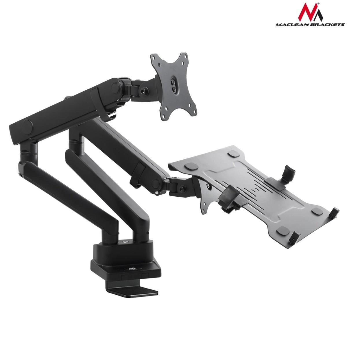 Uchwyt biurkowy podwójny do monitora i laptopa MC-813 zapewnia duży komfort w pracy oraz optymalizuje ergonomię. Poprzez regulację kąta nachylenia, możliwość obrotu oraz zmianę wysokości - uchwyt zapewnia dostosowanie stanowiska do indywidualnych preferencji. Uchwyt wyposażony został w podstawę do laptopa, zastosowanie takiego rozwiązania poprawia komfort i ergonomię pracy z laptopem, jednocześnie zapewniając stylowy wygląd. Ramiona wykonane z wysokiej jakości aluminium - zostały wyposażone w wytrzymałą klamrę montażową, która umożliwia mocowanie do blatu lub innych powierzchni płaskich oraz do otworów w blacie. Idealne do zastosowania m.in. w biurze i domu - bez wiercenia dziur w biurkach lub ścianach.