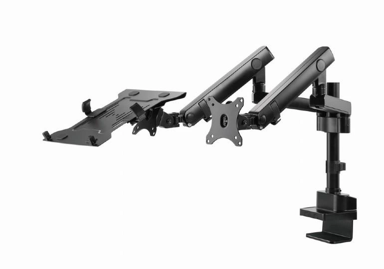 Regulowane ramię monitora montowane na biurku z półką na notebooka (pełny ruch)