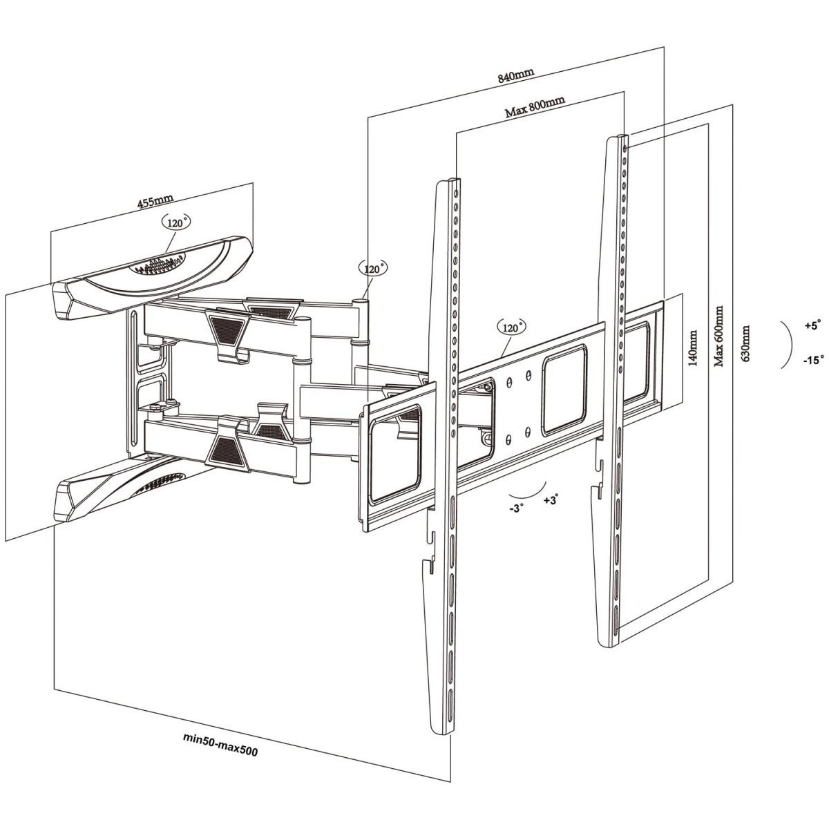 Bardzo długie, podwójne ramię uchwytu pozwala na szeroki zakres obrotu telewizora. Dodatkowo istnieje możliwość poziomowania telewizora po zamontowaniu +3/-3°. Do uchwytu bez problemu przymocujemy ekran w standardzie VESA: 100x200, 200x200, 200x300, 300x200, 200x400, 400x200, 300x300, 300x400, 400x300, 600x200, 400x400, 600x300, 400x600, 600x400, 700x400, 800x400, 600x600, 800x500, 800x600 mm. W komplecie znajduje się poziomica, która ułatwia precyzyjny montaż, oraz zestaw śrub montażowych, co czyni instalację prostą i bezproblemową.