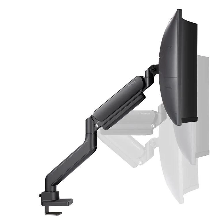 Neomounts DS70PLUS-450BL1 NEXT Core to w pełni ruchomy uchwyt na biurko do zakrzywionych ultraszerokokątnych ekranów do 49 cali. Uchwyt ma wzmocnioną głowicę zaprojektowaną specjalnie dla zakrzywionych ultraszerokokątnych ekranów i wytrzymuje wyższą maksymalną masę do 18 kg ( zakrzywiony 14 kg). Wszechstronna technologia pochylenia (90°), obrotu (360°) i obrotu (180°) umożliwia zmianę kąta widzenia uchwytu, aby w pełni wykorzystać możliwości ekranu. Dodatkowo uchwyt posiada sprężynową regulację wysokości (26,155 cm) i regulację głębokości (5,449,7 cm), aby stworzyć idealną pozycję roboczą.