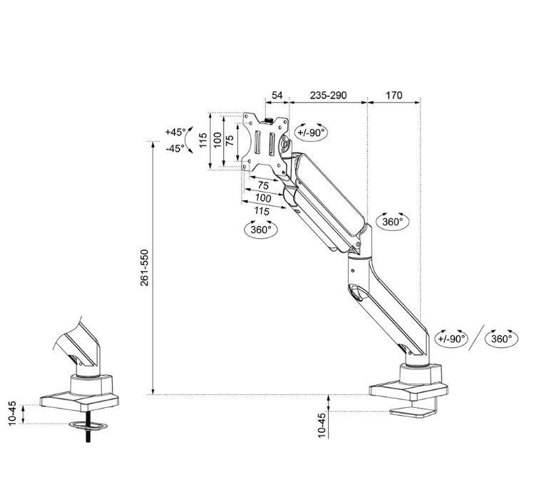 DS70PLUS-450BL1 NEXT Core jest wyposażony w sprytny mechanizm zatrzymujący 180°, który umożliwia bezpiecznie dostosowanie uchwytu, nawet jeśli jest umieszczony blisko ściany lub panelu separacyjnego, nie dotykając ściany. Inteligentny system zarządzania kablami zapewnia uporządkowane prowadzenie kabli.