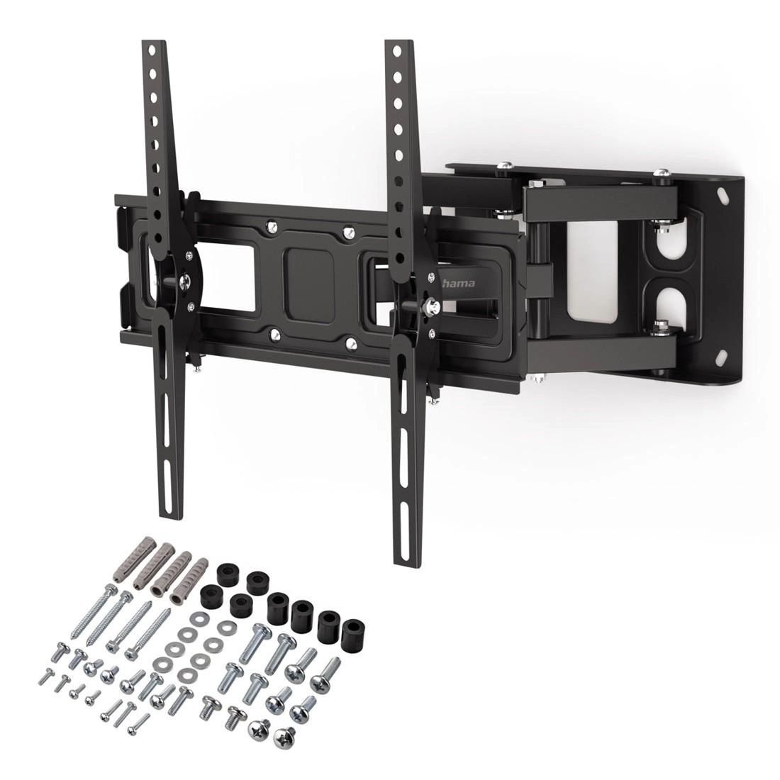 Wraz z uchwytem do telewizora Hama Fullmotion otrzymujesz zestaw montażowy, w tym kołki renomowanej marki Fischer, poziomnicę, szablon wiercenia oraz instrukcję montażu. Jeśli uchwyt został lekko krzywo zamontowany, można później korygować pozycję telewizora pod kątem kilku stopni w poziomie.