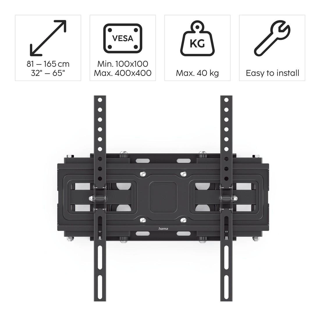 Uchwyt do telewizora Hama jest przeznaczony do urządzeń o przekątnej ekranu od 32" do 65" (81 165 cm). Jest zgodny ze standardem VESA od 100 x 100 do 400 x 400. Maksymalne obciążenie uchwytu wynosi 40 kg.