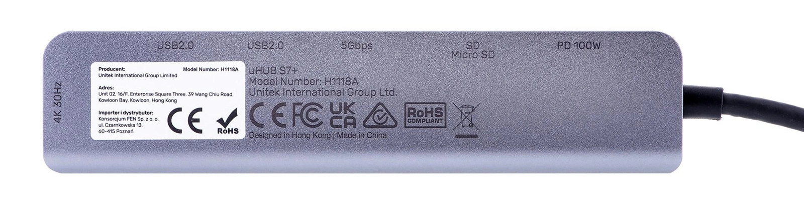 UNITEK HUB USB-C 7W1, HDMI 4K, PD 100W, 5GBPS, ALU