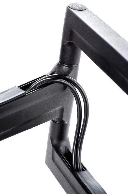 Podwójne obrotowe ramię ścienne VSM653 dedykowane jest do większych ekranów o przekątnej od 49 do 65. Konstrukcja dostosowana jest do częstych zmian położenia monitora, stanowi więc idealne rozwiązanie dla miejsc, w których monitory często zmieniają swoje położenie. Uchwyt ten zbudowany jest z aluminiowych ramion, wewnątrz których prowadzone są przewody, co zapewnia uporządkowaną instalację i estetyczny wygląd. VSM653 daje możliwość obrotu ekranu w prawo i w lewo o 90° oraz możliwość pochylenia ekranu o +11°, co pozwala na dostosowanie położenia ekranu do oczekiwań użytkownika i zwiększa komfort użytkowania.