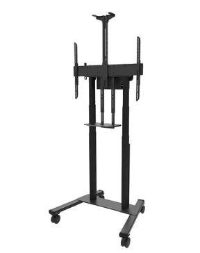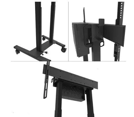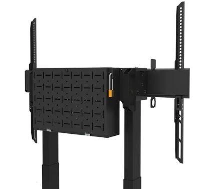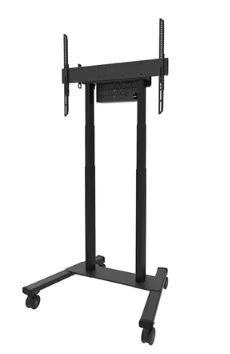 Neomounts FL55-875BL1 to mobilny stojak podłogowy do wyświetlaczy o przekątnej do 100 cali i maksymalnym obciążeniu 110 kg. Wózek ma zmotoryzowaną regulację wysokości w zakresie 65 cm (35 mm/sekundę), jest obsługiwany za pomocą przewodowego pilota zdalnego sterowania i posiada system antykolizyjny dla dodatkowego bezpieczeństwa Zamykana, wentylowana komora na sprzęt z otworem na kabel jest dołączona i opcjonalna do instalacji.