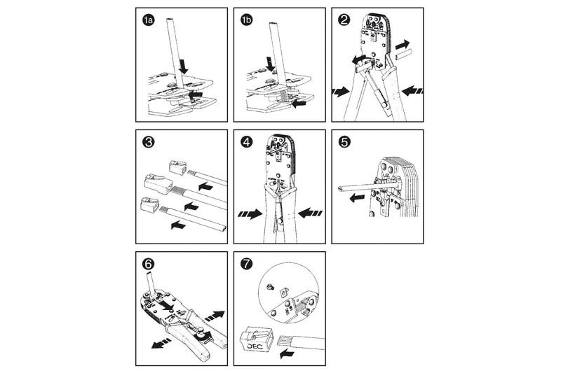Służy do zaciskania złącz: 8P8C-RJ45, 6P6C-RJ12, 6P4C-RJ11, 4P4C, 4P2C, 6P6C DEC, oraz złącz ekranowane 8P8C-RJ45
