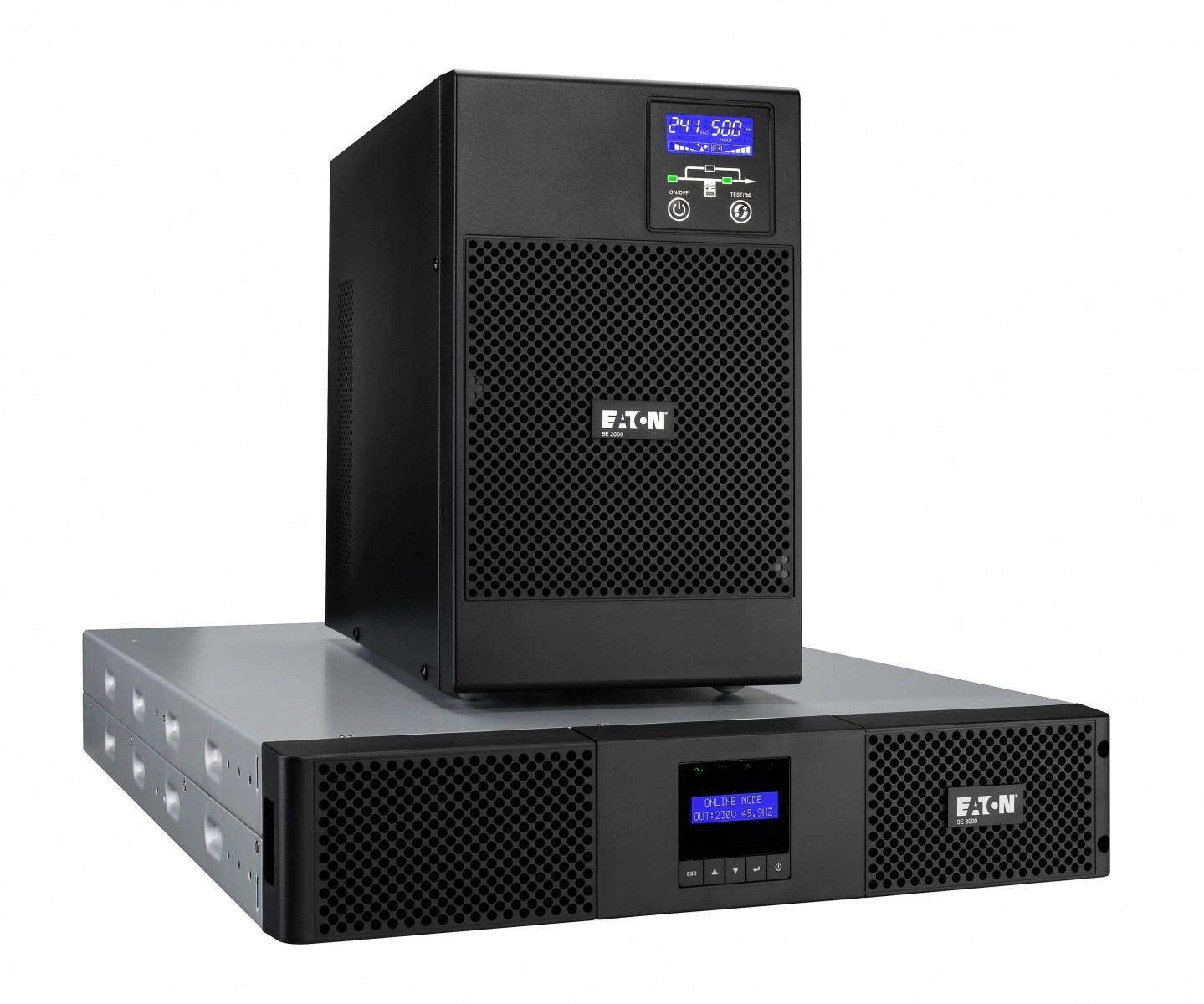 • Eaton 9E Rack stale monitoruje parametry zasilania i odpowiednio reguluje napięcie i częstotliwość dzięki topologii podwójnej konwersji online.