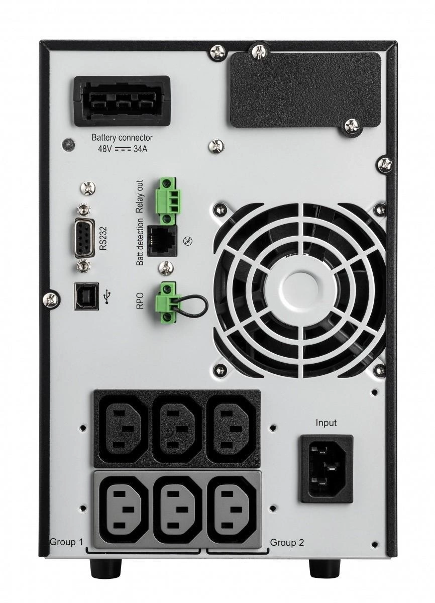 Zasilacz UPS z podwójną konwersją online 1500 VA/1350 W, wielojęzyczny wyświetlacz LCD, licznik energii, 6 gniazd IEC 10 A (2 zarządzalne grupy), gniazdo na opcjonalną kartę zarządzania, USB i porty szeregowe, styki bezpotencjałowe, złącze RPO, oprogramowanie do zarządzania zasilaniem kompatybilne z wirtualnym środowiskiem, baterie wymienialne podczas pracy urządzenia, długi czas pracy awaryjnej z czterema opcjonalnymi modułami EBM.