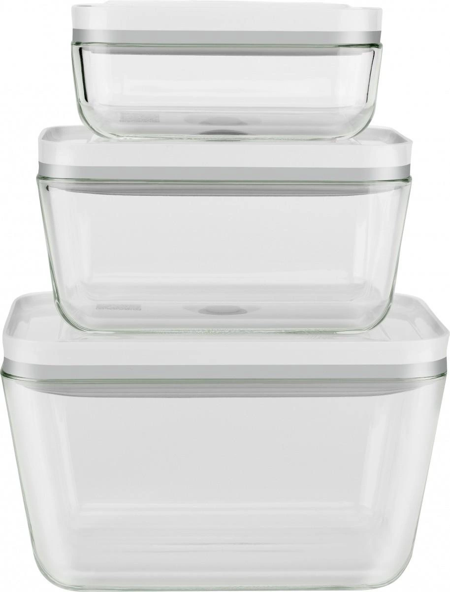 Systematyczny dozorca świeżości: zestaw doskonałej jakości trzech, szklanych pojemników próżniowych.